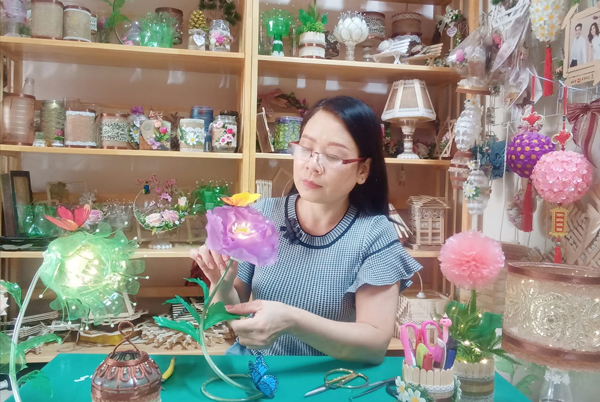Hiện tại, chị chủ yếu tập trung nhiều về các sản phẩm làm đèn ngủ từ chai nhựa, bướm đc làm từ vỏ chai nhựa, túi nilon, làm hoa, tranh trang trí kết hợp từ bìa carton và hoa...