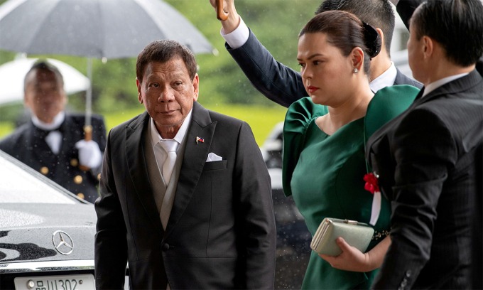 Tổng thống Philippines Rodrigo Duterte (hàng đầu, bên trái) và con gái Sara Duterte-Carpio (váy xanh) dự một sự kiện ở Tokyo, Nhật Bản tháng 10/2019. Ảnh: Reuters.