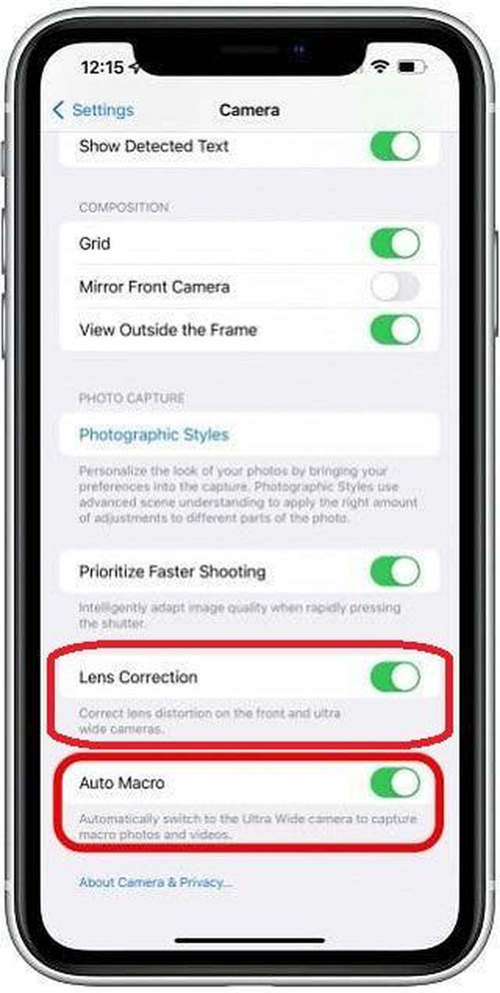 Để tắt các tính năng điều chỉnh camera tự động trên iPhone 13, người dùng cần vào mục Settings => Camera, sau đó gạt tắt phần Auto Macro và Lens Correction.