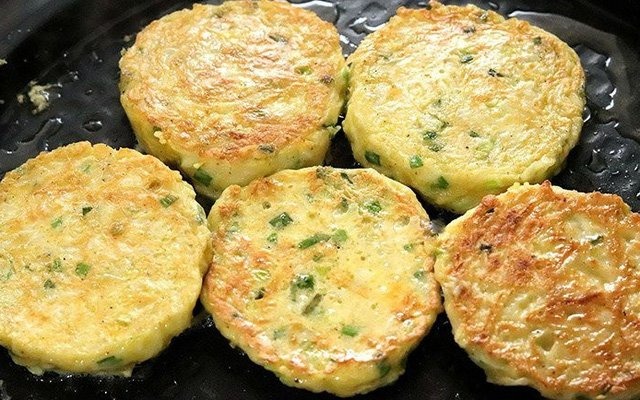 - Làm nóng dầu ăn trong chảo chống dính, sau đó múc từng thìa bột bánh vào, sau đó ấn dẹt xuống.