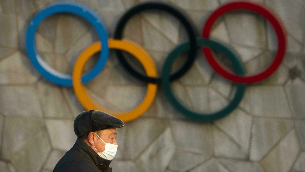 Một người đàn ông đi qua các vòng tròn Olympic, bên ngoài sân vận động quốc gia, địa điểm tổ chức Thế Vận Hội mùa đông 2022 tại Bắc Kinh, ngày 02/02/2021. © AP Photo/Mark Schiefelbein