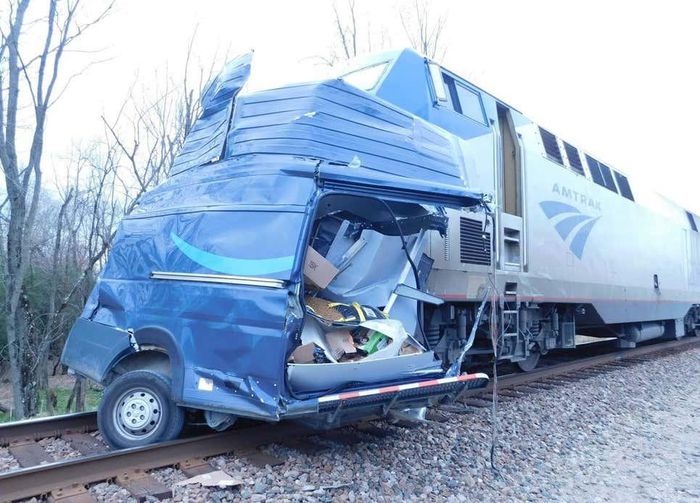 Chiếc xe tải giao hàng của Amazon bị đoàn tàu Amtrak đâm phải tại một giao lộ đường sắt ở Ixonia, WI (Mỹ). Dù chiếc xe đã bị xé làm đôi nhưng rất may là người lái xe tải và các hành khách trên tàu đều không bị hề hấn gì.