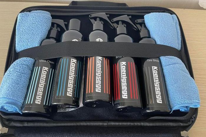 Những đồ chơi bên trong chiếc túi xách này bao gồm 2 khăn lau xe cỡ lớn, loại chuyên dụng dành cho các màu sơn đắt đỏ của hãng xe Koenigsegg, ngoài ra đi kèm là các chai dung dịch rửa xe, vệ sinh khoang lái cũng như chăm sóc bánh xe carbon. Chiếc túi xách quyền lực của các chủ xe Koenigsegg Regera, góc bên phải dưới cùng có logo chiếc khiên của thương hiệu xe Thụy Điển.