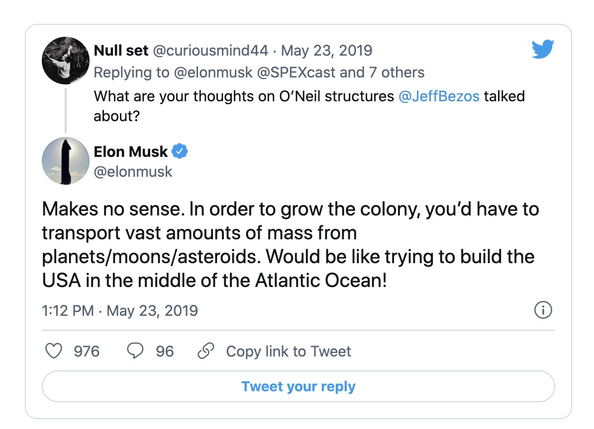 Về phần mình, Musk đã tweet vào năm 2019 rằng kế hoạch của Bezos là không khả thi, vì cần "vận chuyển một lượng lớn vật chất từ các hành tinh/mặt trăng/tiểu hành tinh”. Ông nói điều này: “Giống như xây dựng nước Mỹ ở giữa Đại Tây Dương”.