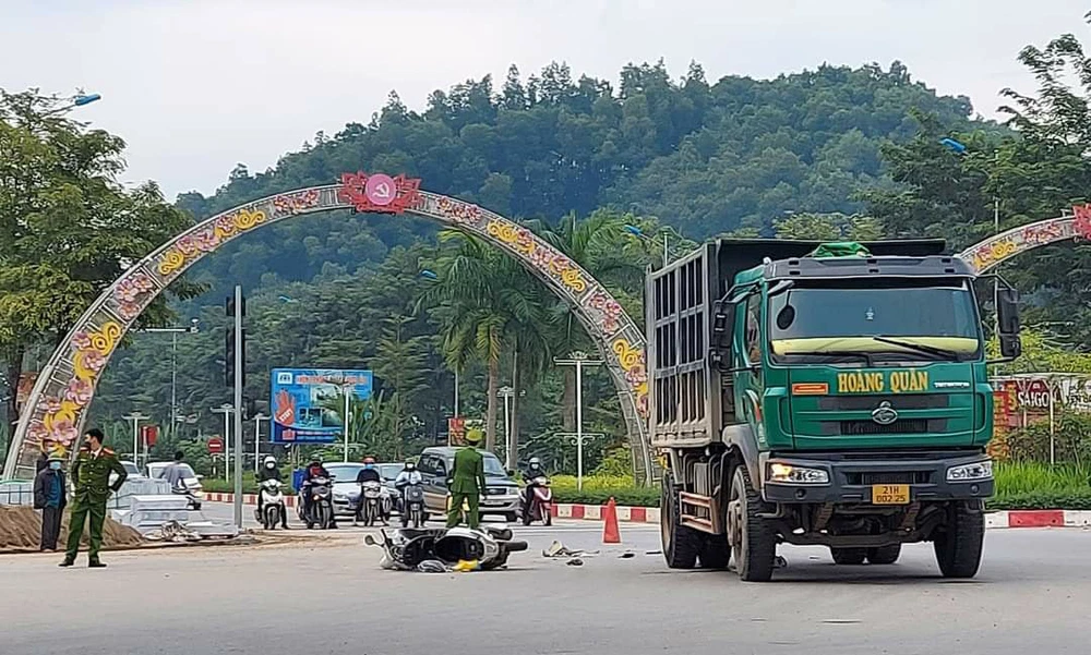 Thời điểm này, xe tải BKS 21H-002.25 và xe máy đang dừng chờ đèn đỏ gần nhau tại ngã tư. Khi đèn chuyển xanh, hai xe bắt đầu di chuyển.