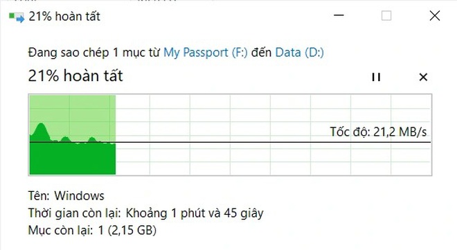 Sử dụng chức năng sao chép mặc định của Windows, tốc độ không ổn định và chỉ đạt tốc độ sao chép dữ liệu khoảng 20MB/s.