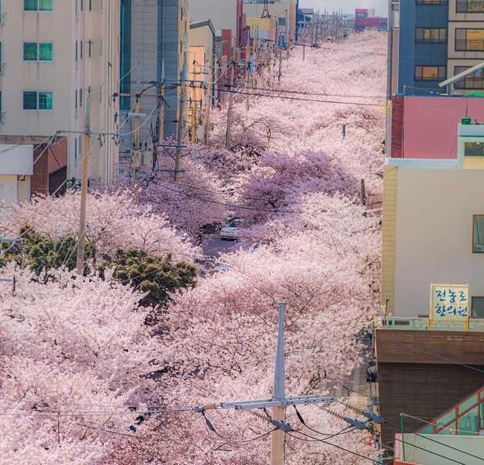 11. Các con đường ở thành phố Jeju ngập tràn sắc hồng của hoa anh đào.