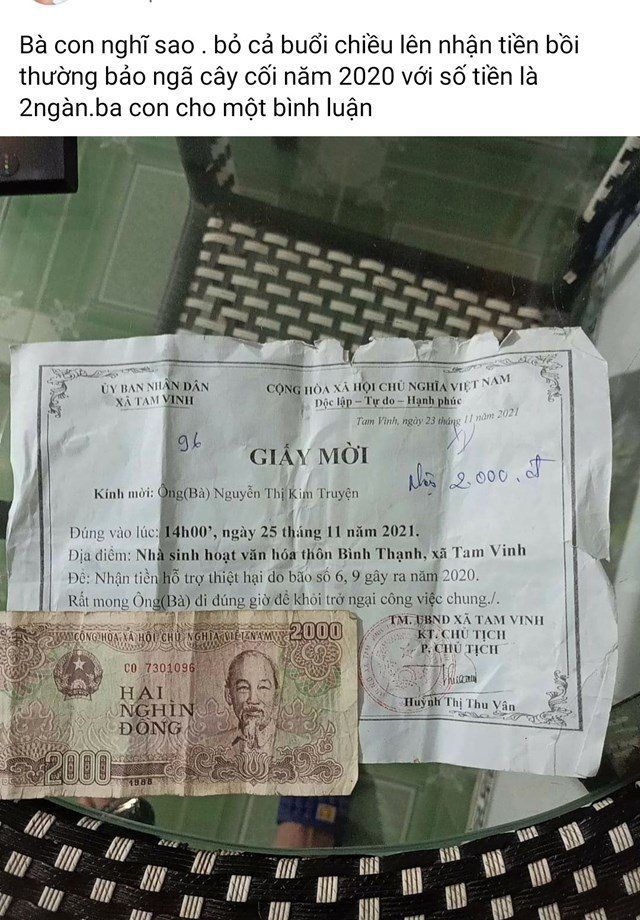 Như đã đưa tin, dân mạng đã chia sẻ một dòng trạng thái từ tài khoản có tên N.T. với nội dung: “Bà con nghĩ sao, bỏ cả buổi chiều lên nhận tiền bồi thường bão ngã cây cối năm 2020 với số tiền là 2.000. Bà con cho một bình luận”.