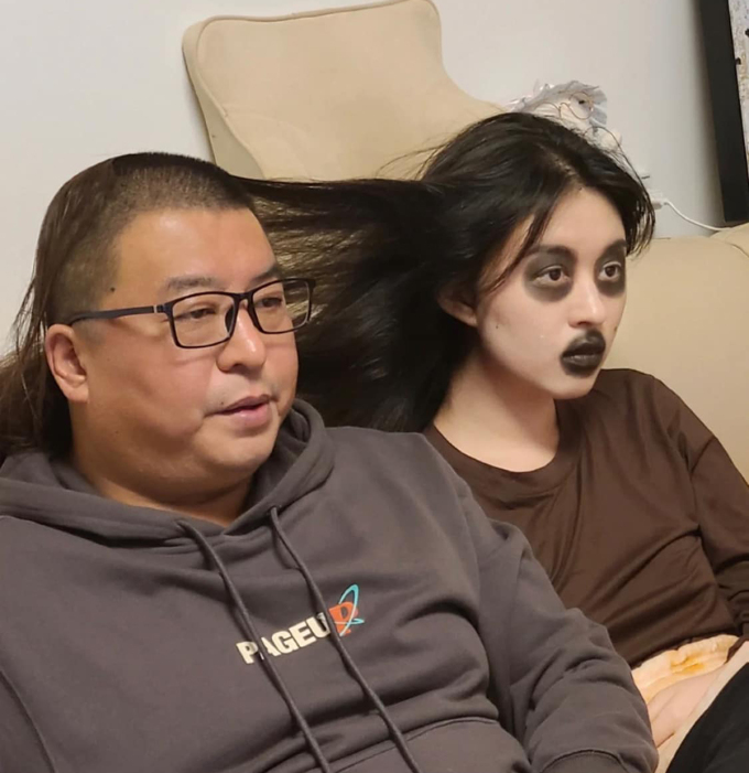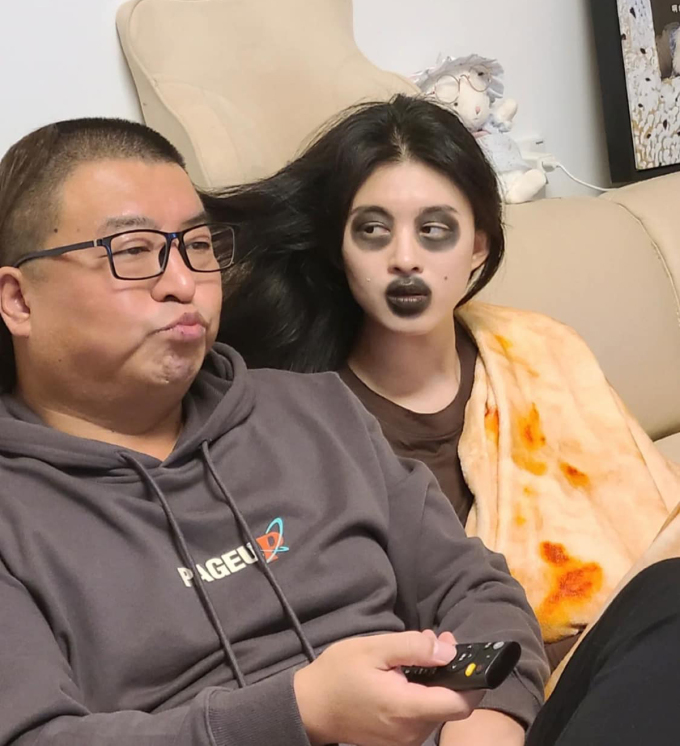 Rất muốn mua iphone nhưng không dám nói, cô gái liền hóa trang mắt, miệng theo h́nh camera của điện thoại rồi liên tục bám sát ông bố.