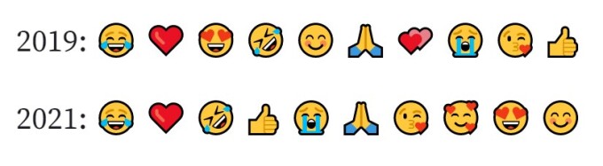 Đây không phải lần đầu Tears of Joy trở thành emoji được dùng nhiều nhất năm. Nó cũng được dùng nhiều nhất vào năm 2019. Năm 2015, biểu tượng này thậm chí khiến Oxford phá lệ, bình chọn là "từ của năm". Năm 2017, khuôn mặt vừa khóc vừa cười cũng được sử dụng nhiều nhất trên các thiết bị Apple, bao gồm cả iOS và MacOS.
