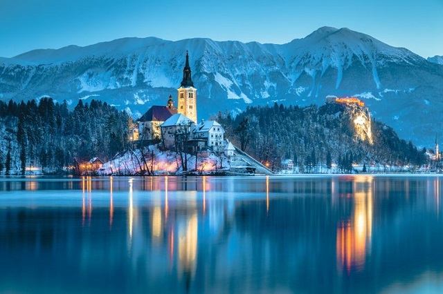 Thị trấn cổ Bled tại Slovenia được mệnh danh là một trong những điểm đến đẹp nhất ở châu Âu. Nơi đây nằm cạnh hồ Bled nổi tiếng và được bao quanh bởi dãy núi Julian Alps hùng vĩ. Ở giữa hồ Bled là một hòn đảo nổi tự nhiên và duy nhất tại Slovenia. Người ta đã xây dựng một Nhà thờ Đức Mẹ Maria trên hòn đảo này. Theo truyền thuyết, nếu bạn ghé thăm nhà thờ này và rung chuông cầu nguyện, điều ước của bạn sẽ trở thành hiện thực. Quang cảnh thanh bình và hiền hòa của thị trấn cổ này đã thu hút một lượng lớn du khách từ khắp nơi trên thế giới.