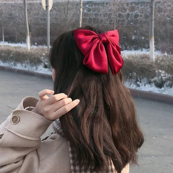 Tóc ruy băng hình nơ màu đỏ nổi bật kết hợp tóc nửa đầu tạo style đáng yêu cho bạn gái. Phong cách này rất hợp với Giáng Sinh.