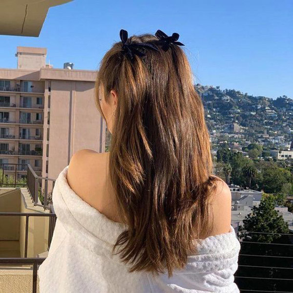 Ruy băng dài và nhỏ như thế này sẽ tạo điểm nhấn nhẹ nhàng cho tóc buộc nửa đầu. Bạn có thể tạo kiểu khi đi làm, đi chơi hay đi học.