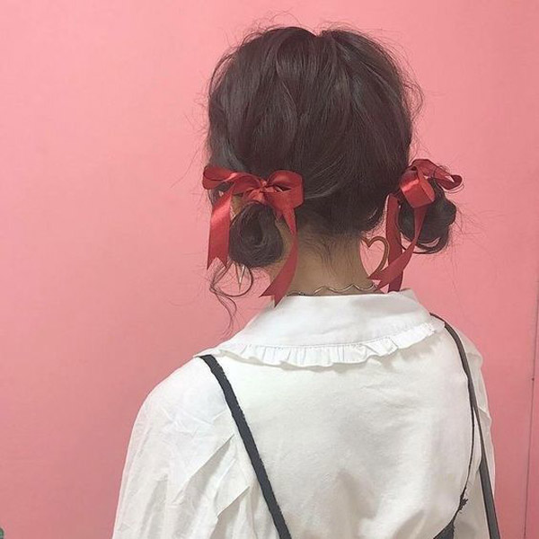 Tóc buộc hoặc búi hai bên cùng ruy băng