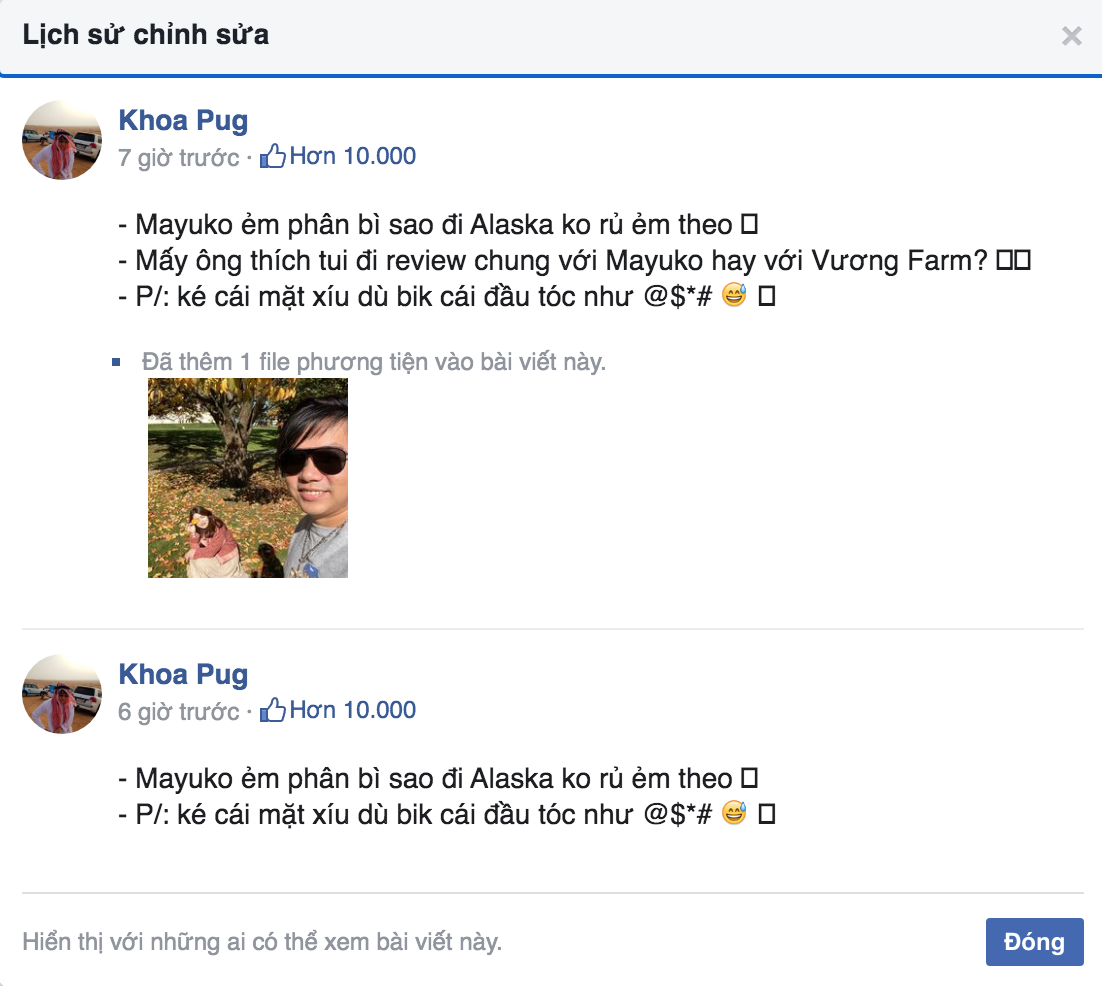 Cụ thể, trong status đầu tiên, nam vlogger viết: "Mayuko, em phân bì sao đi Alaska không rủ em theo. Mấy ông thích tui đi review chung với Mayuko hay với Vương Farm?". Và chưa đầy 1 tiếng sau, nội dung liên quan đến Vương Phạm đã bị Khoa Pug xoá đi, chỉ còn phần về Mayuko - gái xinh người Nhật hay xuất hiện trong các video của Khoa kể từ khi sang Mỹ.