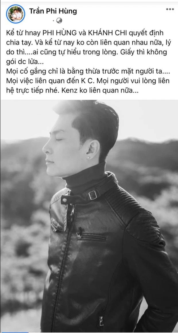 'Kể từ nay, Phi Hùng và Khánh Chi quyết định chia tay. Và kể từ nay không còn liên quan nhau nữa, lý do thì ai cũng tự hiểu trong lòng. Giấy thì không gói được lửa', Phi Hùng viết.