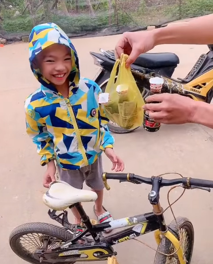 Theo đó, một cậu bé đi xe đạp đến một quán tạp hóa gần nhà và mua đồ theo lời ba căn dặn.