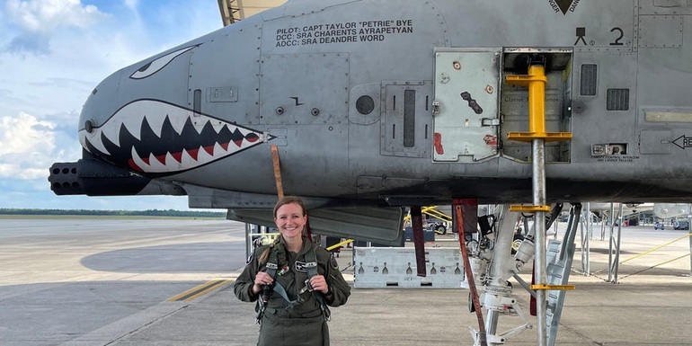 Nữ phi công không quân Mỹ Taylor "Petrie" Bye chụp ảnh cùng chiếc A-10 (Ảnh: BI).