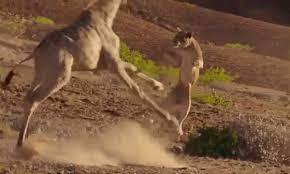 Thấy hươu cao cổ vừa tiến đến, con sư tử cái bật cao, cố bám vào cổ rồi ghì chặt đối phương xuống đất. Tuy nhiên, cú vồ hụt của sư tử lại rơi đúng vào tầm di chuyển của con mồi và hậu quả nó đã bị hươu cao cổ giẫm đạp liên tiếp.