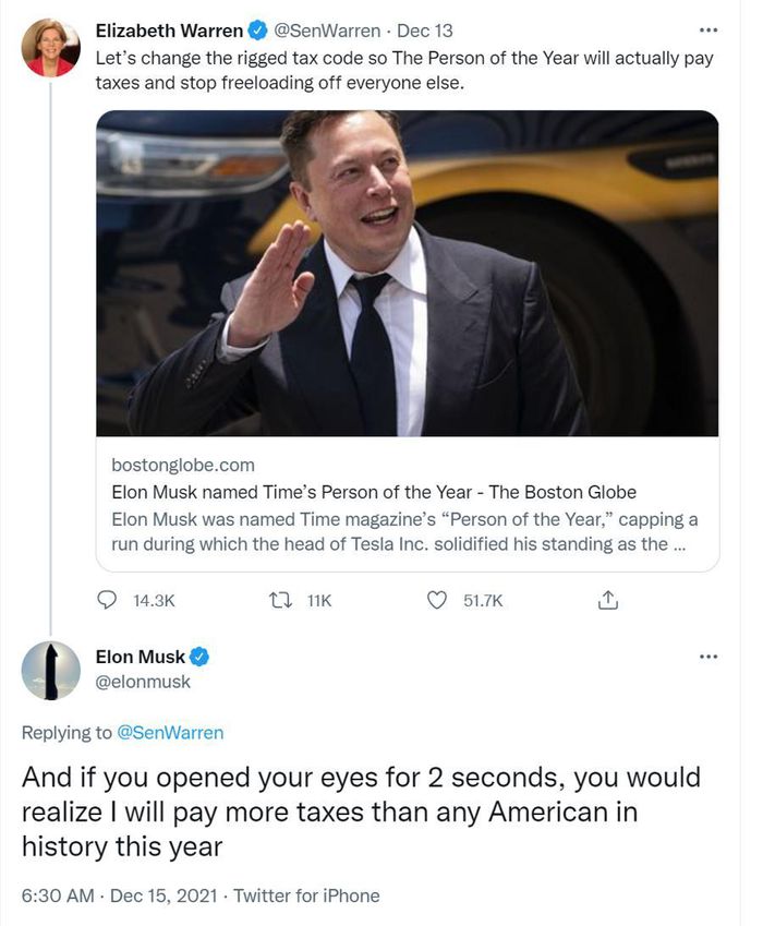 "Nếu bà chịu mở mắt ra nhìn trong 2 giây, bà sẽ nhận ra rằng tôi sẽ nộp nhiều thuế hơn bất kỳ người Mỹ nào trong lịch sử", ông Musk đáp trả gay gắt bà Warren - người nổi tiếng với việc đấu tranh để giảm bất bình đẳng giàu nghèo, cho rằng giới giàu Mỹ phải nộp nhiều thuế hơn.