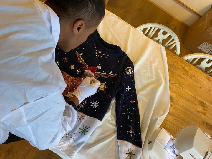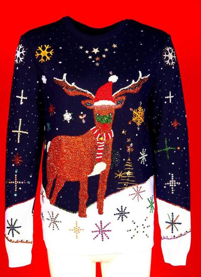 Chiếc áo len Giáng sinh được may bằng chỉ lụa vàng 24k giá 300 bảng Anh từ một cửa tiệm chuyên dụng ở Pháp, 2.000 viên pha lê Swarovski trị giá 1.000 bảng Anh và riêng lớp lót lụa Ý màu xanh navy đã tốn 200 bảng Anh. Giữa áo là hình chú tuần lộc lớn màu đỏ, điểm tô những ngôi sao nạm bạc cầu kỳ và đính kết 150 viên kim cương giá 5.000 bảng Anh. Phần thân chính làm từ len và bông cao cấp được mô tả là “mềm mại như lông chú mèo con”. Thậm chí chiếc khăn trắng đỏ trên cổ tuần lộc còn được gắn vàng và đá Swarovski.