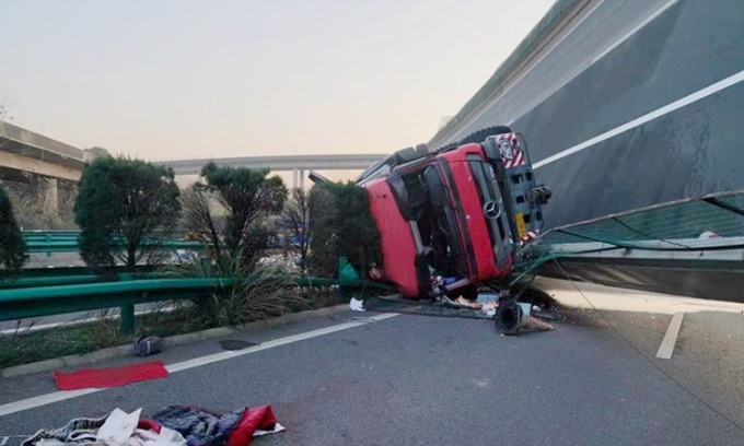 Một chiếc xe tải bị lật tại hiện trường. Ảnh: Caixin.
