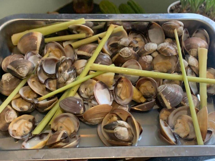 + Chuẩn bị 1 nồi nước, đập dập 1 của sả đun sôi rồi trần nghêu cho đến khi nghêu mở miệng vớt ra để ráo nước.