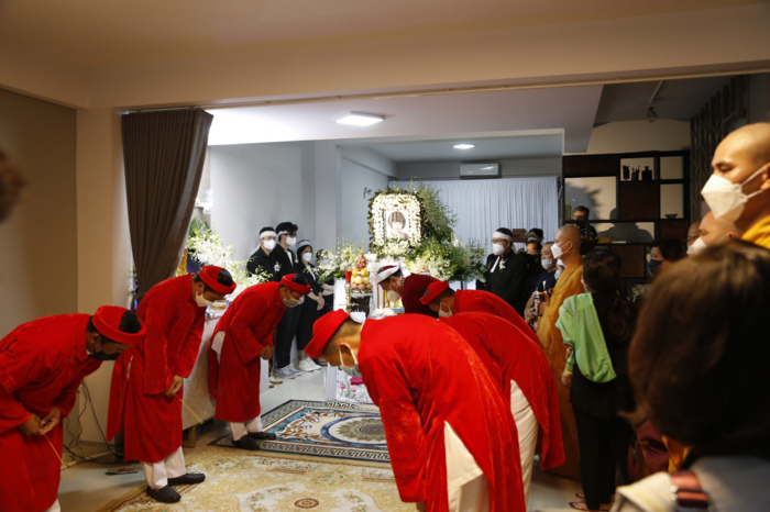 NSƯT Thành Lộc lặng lẽ nép ở một góc chờ đến giờ di quan. NSND Thanh Tuấn túc trực tại tang lễ, Hồng Tơ cũng có mặt.