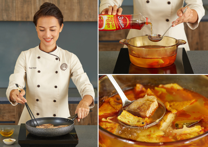 Một lần, khi cầm trái thơm trên tay, chef Tuyết Phạm nhớ những lát mứt thơm vàng sánh ươm mẹ làm ngày Tết. Hình ảnh giản dị ấy đã truyền cảm hứng cho chef Tuyết Phạm đưa hương vị, màu sắc của những trái thơm ngày Tết vào món ăn quê hương, mang đến sự sáng tạo táo bạo cho món bún chả cá. Xào thơm với đường và nước mắm, chút biến tấu đó tạo nên độ thơm, sánh đậm đà, làm nên vị đặc trưng riêng cho món bún chả cá quê hương. Để đạt vị đậm đà đúng chuẩn, chef Tuyết Phạm chọn nước chấm 3 Miền với hương thơm dịu nhẹ, cùng màu vàng nâu sóng sánh.