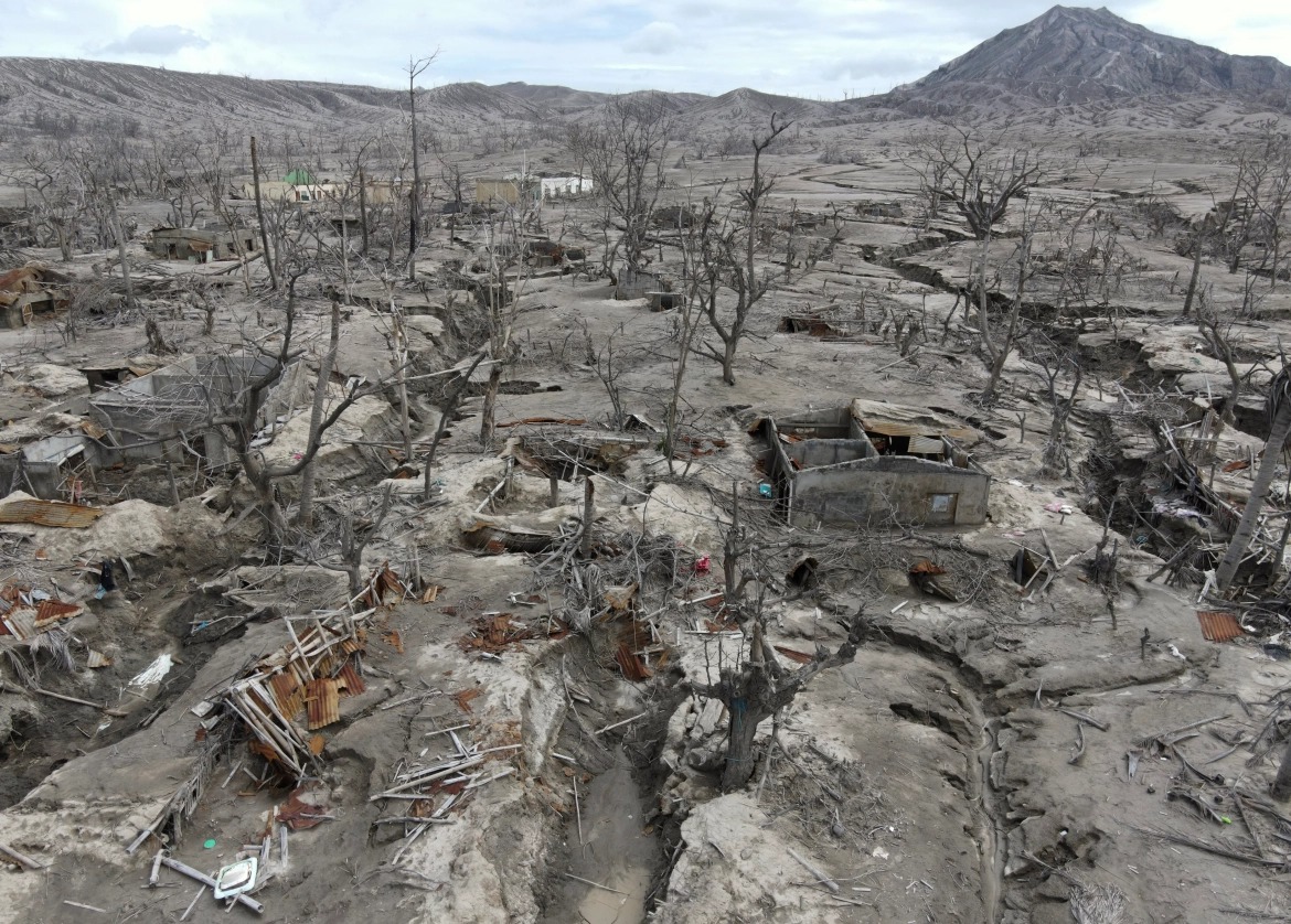 Những thân cây trơ trọi và những ngôi nhà nằm vùi một nửa trong bùn gần núi lửa Taal gần một năm sau thảm họa phun trào ở tỉnh Batangas, một địa điểm du lịch nổi tiếng ngay phía nam Manila, Philippines, vào ngày 10 tháng 1 năm 2021. Ảnh AP