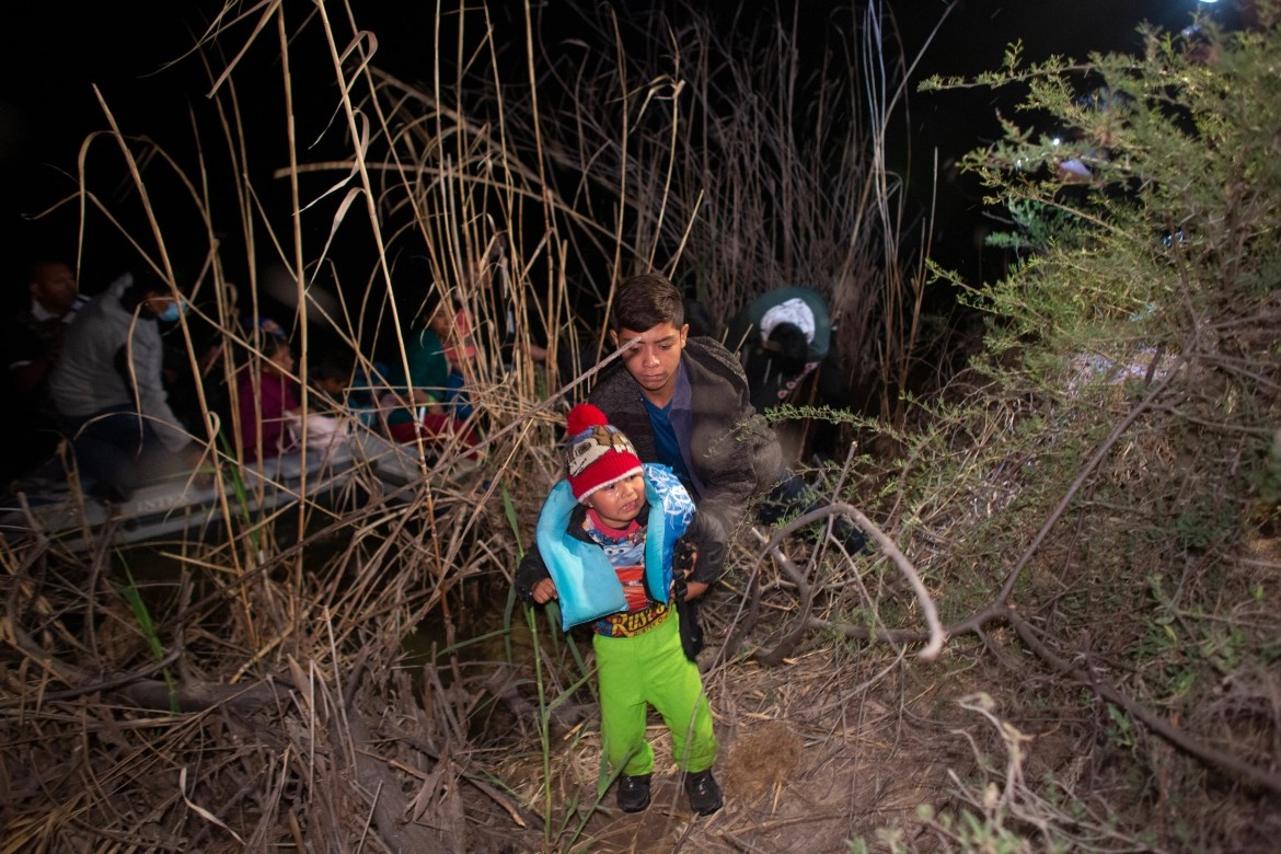 Một đứa trẻ khóc khi được đưa xuống từ một chiếc bè bơm hơi sau khi bị buôn lậu qua sông Rio Grande vào Mỹ, ở Roma, Texas, vào ngày 28 tháng 3 năm 2021. Ảnh AP