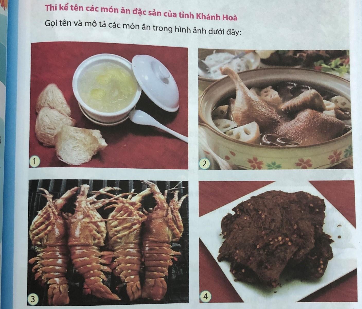 Ở chủ đề đặc sản, ẩm thực địa phương tỉnh Khánh Hòa, Tài liệu giáo dục địa phương lớp 6 đã giới thiệu với học sinh những món ăn nức tiếng xưa nay mỗi khi du khách đến du lịch đều phải thưởng thức.