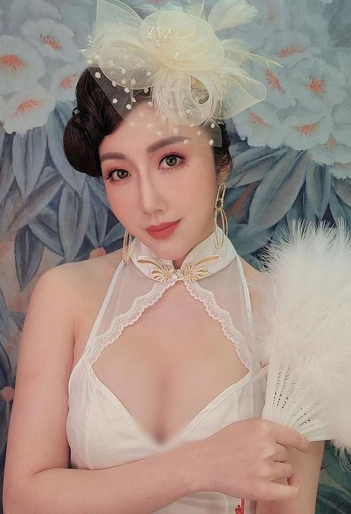 Trong bộ xường xám cách điệu, hở vai, khoét ngực khá sâu, hot girl xinh đẹp khoe được nét gợi cảm phong tình của mình.