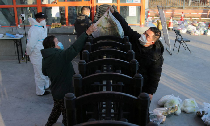 Người dân nhận thực phẩm qua rào chắn tại một khu dân cư đang bị phong tỏa vì Covid-19 ở Tây An, Trung Quốc, hôm 29/12/2021. Ảnh: Reuters.