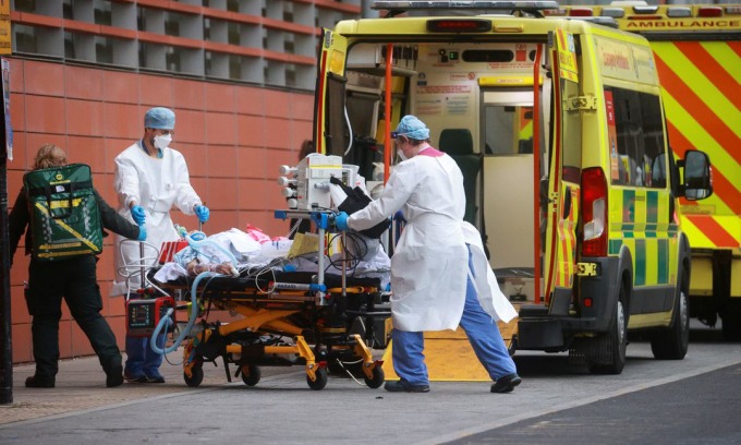 Nhân viên y tế chuyển bệnh nhân rời xe cứu thương tại Bệnh viện Hoàng gia London, ở thủ đô London, Anh hồi tháng 1/2021. Ảnh: Reuters.