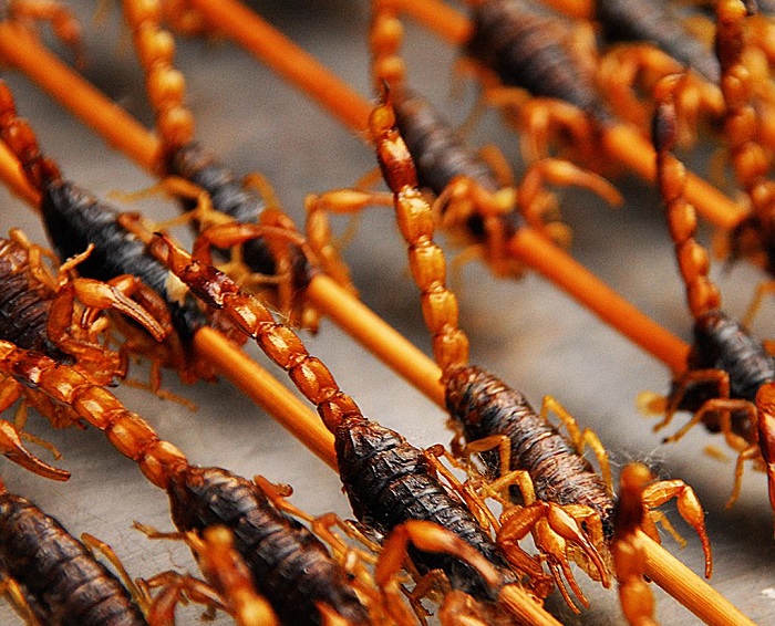 Khi đi dạo trên các con phố ở Trung Quốc, không khó để tìm thấy một quán bán côn trùng chiên trong đó có bọ cạp. Những con bọ cạp chiên này được xiên vào que và chiên giòn đạt đến màu vàng vô cùng đẹp mắt. Người ta tin rằng, món ăn này có thể làm ấm cơ thể trong mùa đông và chữa được một vài bệnh lý.