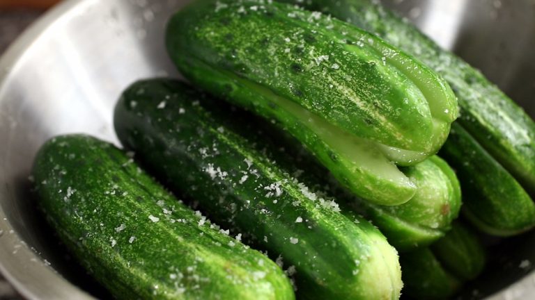 Bước 2: Cho dưa chuột vào một cái bát lớn, rắc và xát muối từ trong ra ngoài. Để dưa ngấm gia vị trong 10 phút sau đó lật lại để dưa ngấm gia vị đều, để thêm 10 phút nữa.