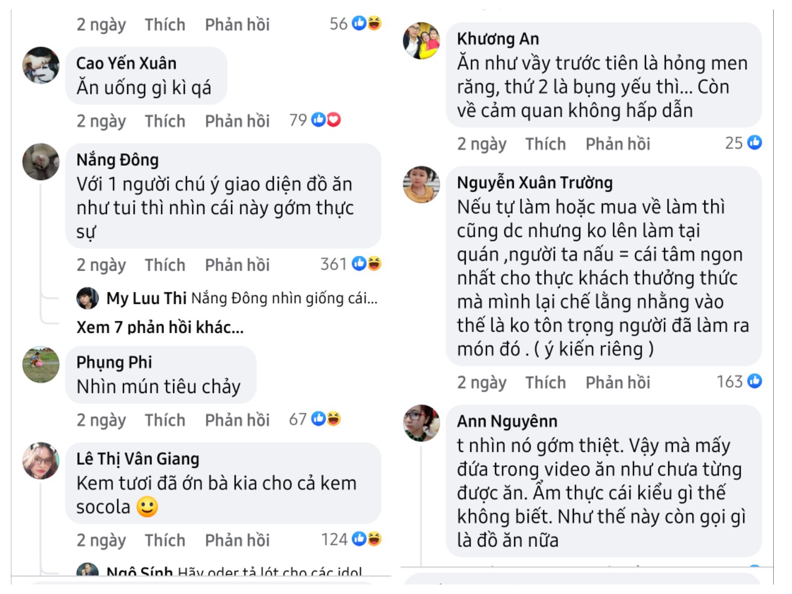 Trong khi đó, nhiều người không đồng tình với việc trộn kem với mì. Chẳng hạn, các video của Hồng Thế, Khánh Huyền trên mạng xã hội cũng nhận được những lời chê bai như “ghê quá!”, “nhìn muốn đi vệ sinh”, “làm vậy mất ngon của món Thái”…