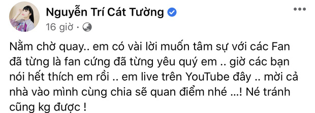 Cát Tường đăng dòng trạng thái mới, thu hút sự chú ý của cư dân mạng. "Nằm chờ quay, em có vài lời muốn tâm sự với các fan đã từng là fan cứng đã từng yêu quý em. Giờ các bạn nói hết thích em rồi, em live trên YouTube đây, mời cả nhà vào mình cùng chia sẻ quan điểm nhé. Né tránh cũng không được".