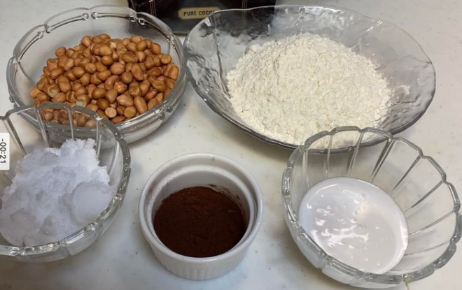 - Rây bột mì đã trộn nguyên liệu tạo vị vào đậu phộng, lắc đều tay cho bột bám chắc vào từng hạt. Với vị ruốc khô, cho từng muỗng ruốc trong quá trình rây bột mì để sợi ruốc bám đều quanh các hạt. Cứ như vậy lần lượt cho cốt dừa và bột vào thau lắc cho đến khi hết nguyên liệu.