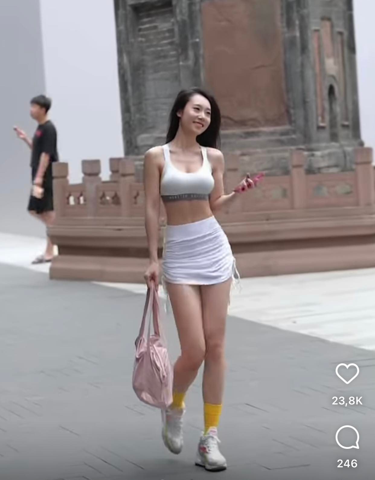 Mới đây, một hot girl phòng gym lại thu hút mọi ánh nhìn của người đi đường nhờ mix chân váy rút dây cao ngang hông theo phong cách "khác lạ".