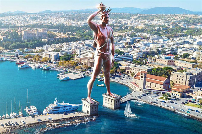 Colossus of Rhodes, Hy Lạp: Bức tượng hùng vĩ này phải mất 12 năm từ năm 942-282 trước Công nguyên để xây dựng. Đây là tác phẩm điêu khắc bằng đồng của thần mặt trời Hy Lạp Helios đã đứng ở bến cảng Rhodes với độ cao khổng lồ 32m. Hình ảnh trên đã tái tạo lại bức tượng vào thời điểm ấy.