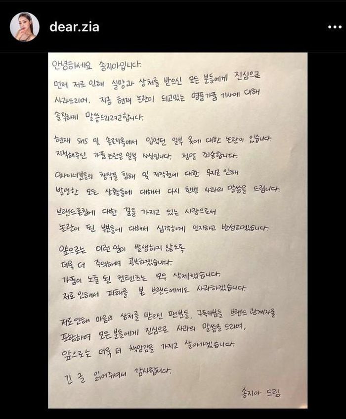 Trước những tranh cãi xung quanh vấn đề dùng hàng giả, Song JiA đã chính thức đăng thư tay xin lỗi và thú nhận mình thực sự đã dùng hàng không chính hãng tham gia show hẹn hò đình đám của Netflix.