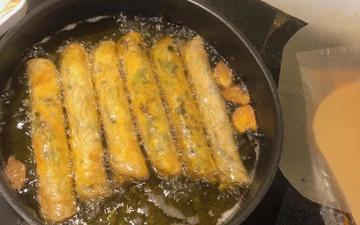 Nem gói xong đem rán sơ qua một lần cho lớp vỏ hơi vàng thì vớt ra, xếp lên giấy thấm dầu và để nguội.