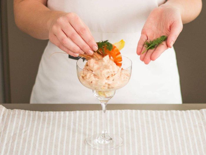 Chuyển rau diếp xoăn Pháp, bơ và tôm vào ly rồi phủ sốt cocktail lên trên. Thưởng thức kèm thì là thái nhỏ.