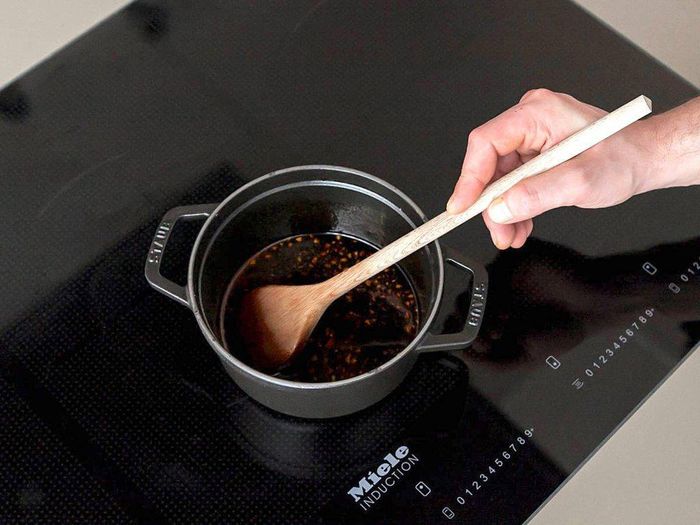 Cho nước sốt vào nồi nhỏ và đun sôi, rồi giảm xuống mức lửa vừa. Thỉnh thoảng, trộn hỗn hợp trong khi đun nhỏ lửa đến khi sánh lại, đủ độ đặc.