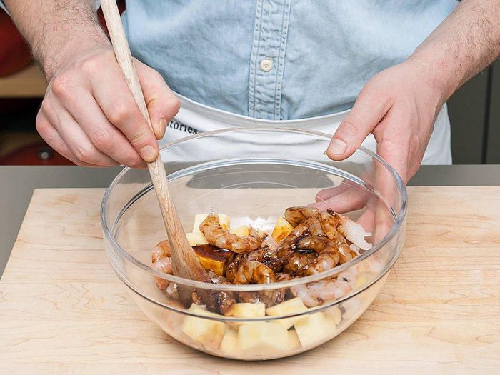 Chuyển dứa sang tô, thêm tôm, nước sốt (đã làm ở bước một) và trộn đều. Cho vào tủ lạnh khoảng 30 phút.