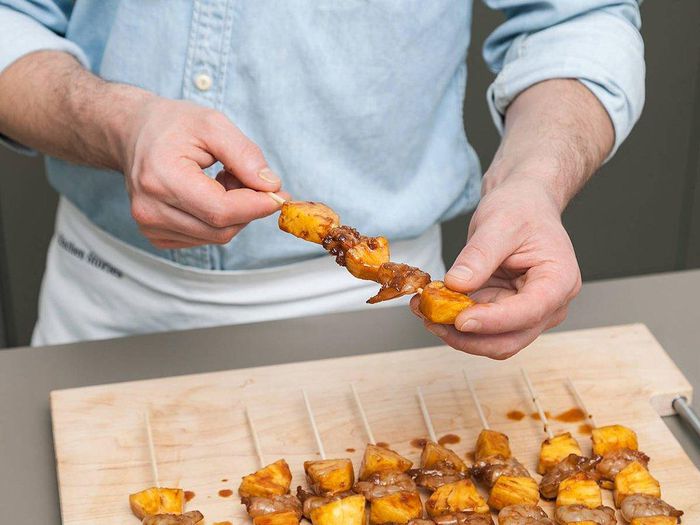 Lấy dứa và tôm đã ướp ra khỏi tủ lạnh, lần lượt xâu dứa và tôm vào xiên.