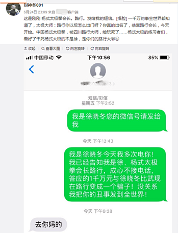 Đoạn tin nhắn giữa Từ Hiểu Đông và Lộ Hành được võ sĩ MMA công bố. Từ giới thiệu tên, nhắc về vụ cá cược 1,45 triệu USD, và nói Lộ hãy gọi lại khi nhận được tin nhắn. Đáp lại, cao thủ Thái Cực lạnh lùng: "Về với mẹ ngươi đi".