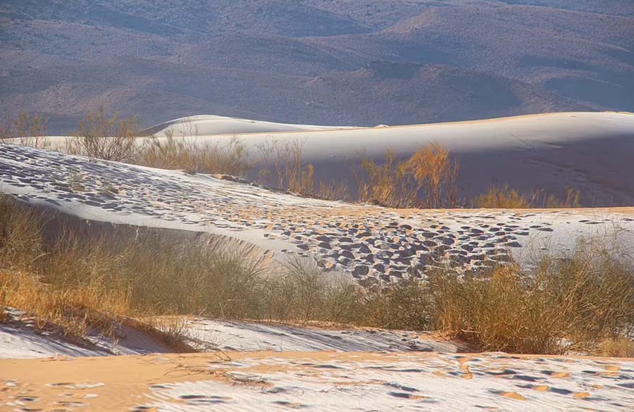Tuyết rơi, băng phủ trên các cồn cát là một hiện tượng hiếm gặp ở sa mạc lớn nhất thế giới – Sahara, nơi luôn có nhiệt độ cao lên tới 58 độ C.